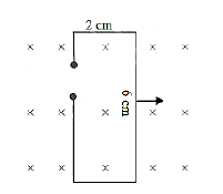A rectangular loop of sides 6 cm and 2 cm with a small cut is moving out of a region of uniform magnetic field of magnitude 0.4 T directed normal to the loop. The voltage developed across the cut if velocity of loop is in a direction normal to the longer side is:
