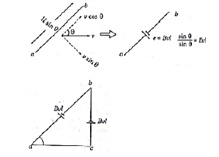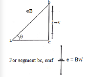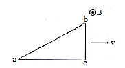 A right-angled triangle abc, made from a metallic wire, moves at a uniform speed v in its plane as shown in figure. A uniform magnetic field B exists in the perpendicular direction. The emf induced in the loop abc, in the segment bc, in the segment ac and in the segment ab are: