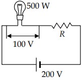 In order that the bulb draws 500 W, there should be 100 V applied across it. The remaining 100 V should be dropped in the series resistance R. Now, the current in the bulb is given by