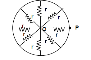 As shown in the figure, the ends of eight identical resistors, each having resistance r are connected to a point O & the other ends are connected to a circular conductor. The equivalent resistance between O & P is equal to