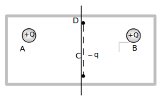 Two similar charges of +Q as shown in figure are placed at points A and B. – q charge is placed at point C midway between A and B. – q charge will oscillate if