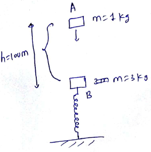 A body of mass 1kg falls freely from a height of 100m, on a platform of mass 3kg which is mounted on a spring having spring constant k = 1.25 X 106N/m. The body sticks to the platform and the spring's maximum compression is found to be x. Given that g = 10ms-2, the value of x will be close to: