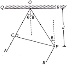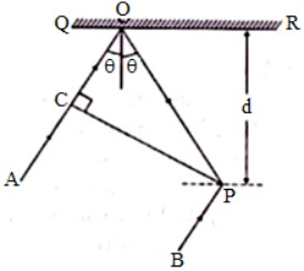 In the below diagram, CP represents a wavefront and AO and BP, the corresponding two rays. Find the condition of for constructive interference at P between the rays BP and reflected ray AOP: