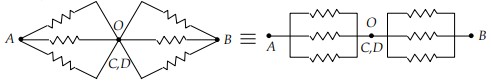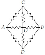 If a potential is applied across A and B, due to symmetry, the points C, O and D will have same potentials. We can therefore join all these points without affecting current in any branch. The network then reduces to