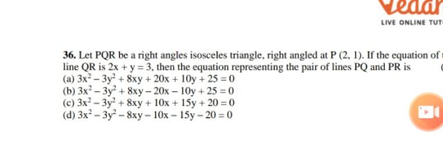 line QR is 2x + y = 3. then the equation representing the pair of lines PQ and PR is