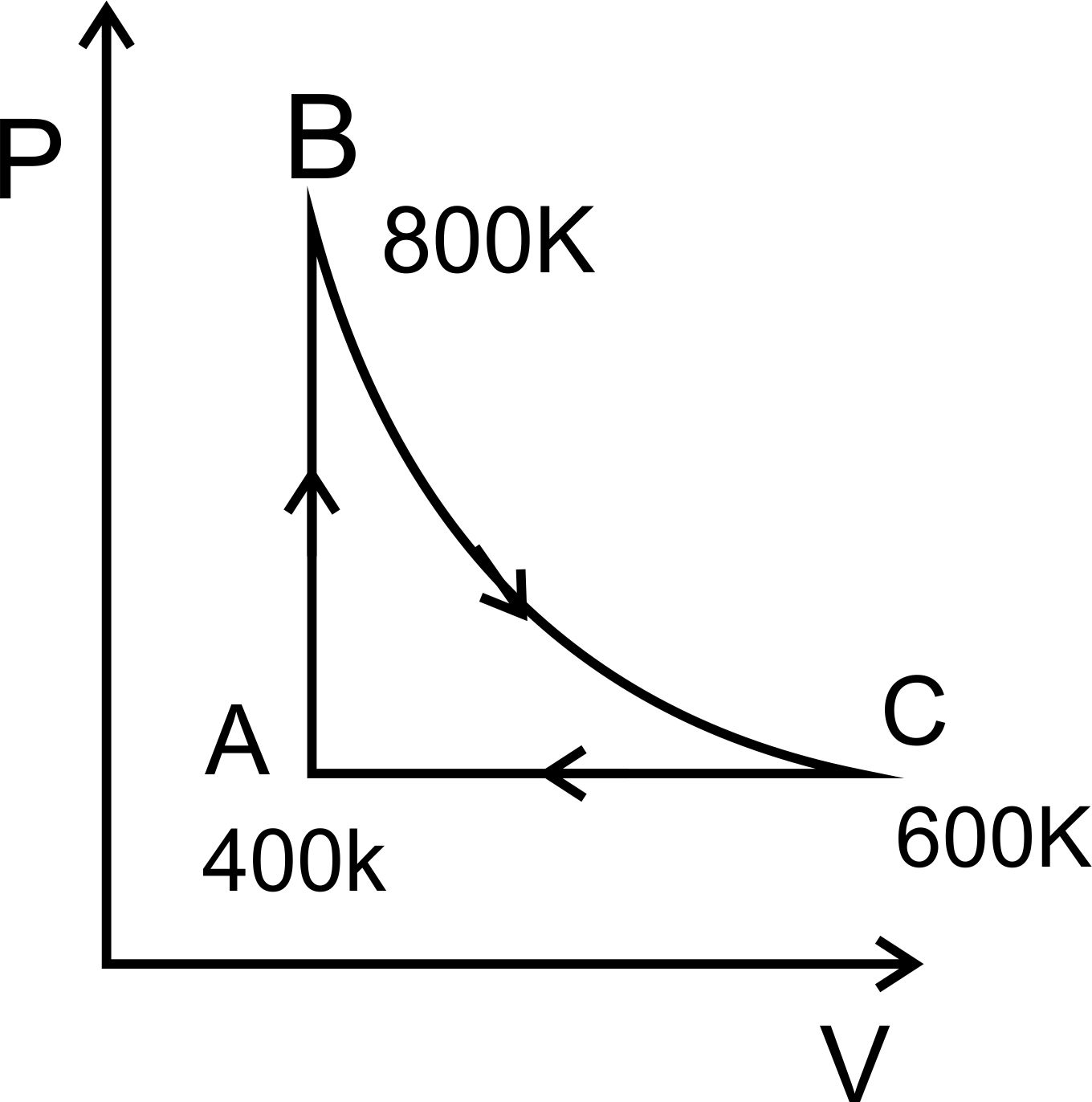 One mole of diatomic ideal gas undergoes a cyclic process ABC as shown in figure. The process BC is adiabatic. The temperatures at A, B and C are 400 K, 800 K and 600 K respectively. Choose the correct statement :