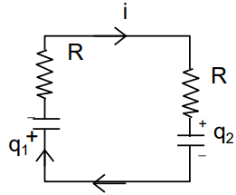 Suppose that the circuit shown in the adjacent figure was connected to a source of emf and switched on. After a long time, the circuit is switched off. The charge on the capacitors as a function of time after the external circuit is switched off is