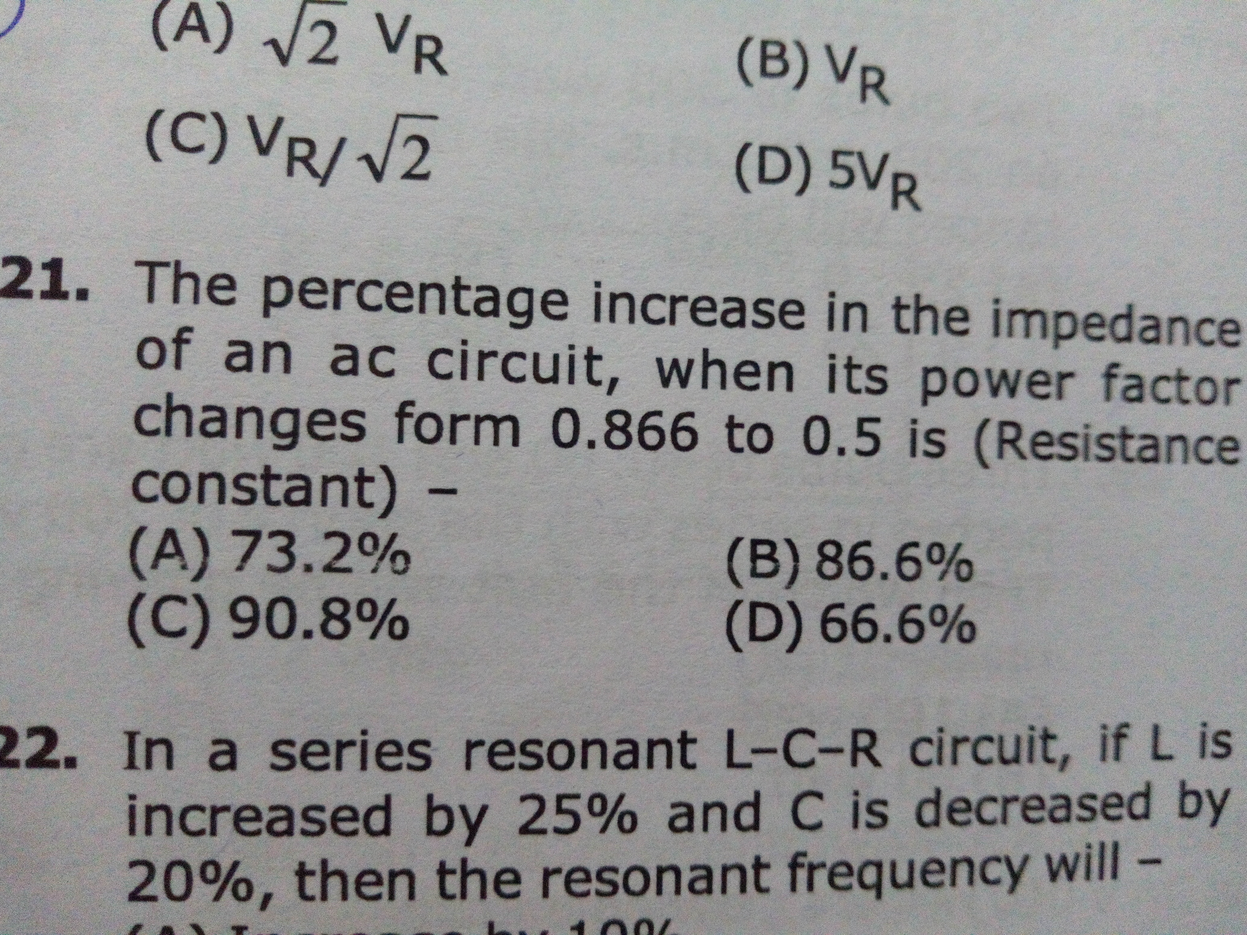 the percentage increase in the impedence of an ac circuit, when its powerfacor changes from 0.866 to 0.5 is (resistance constant)