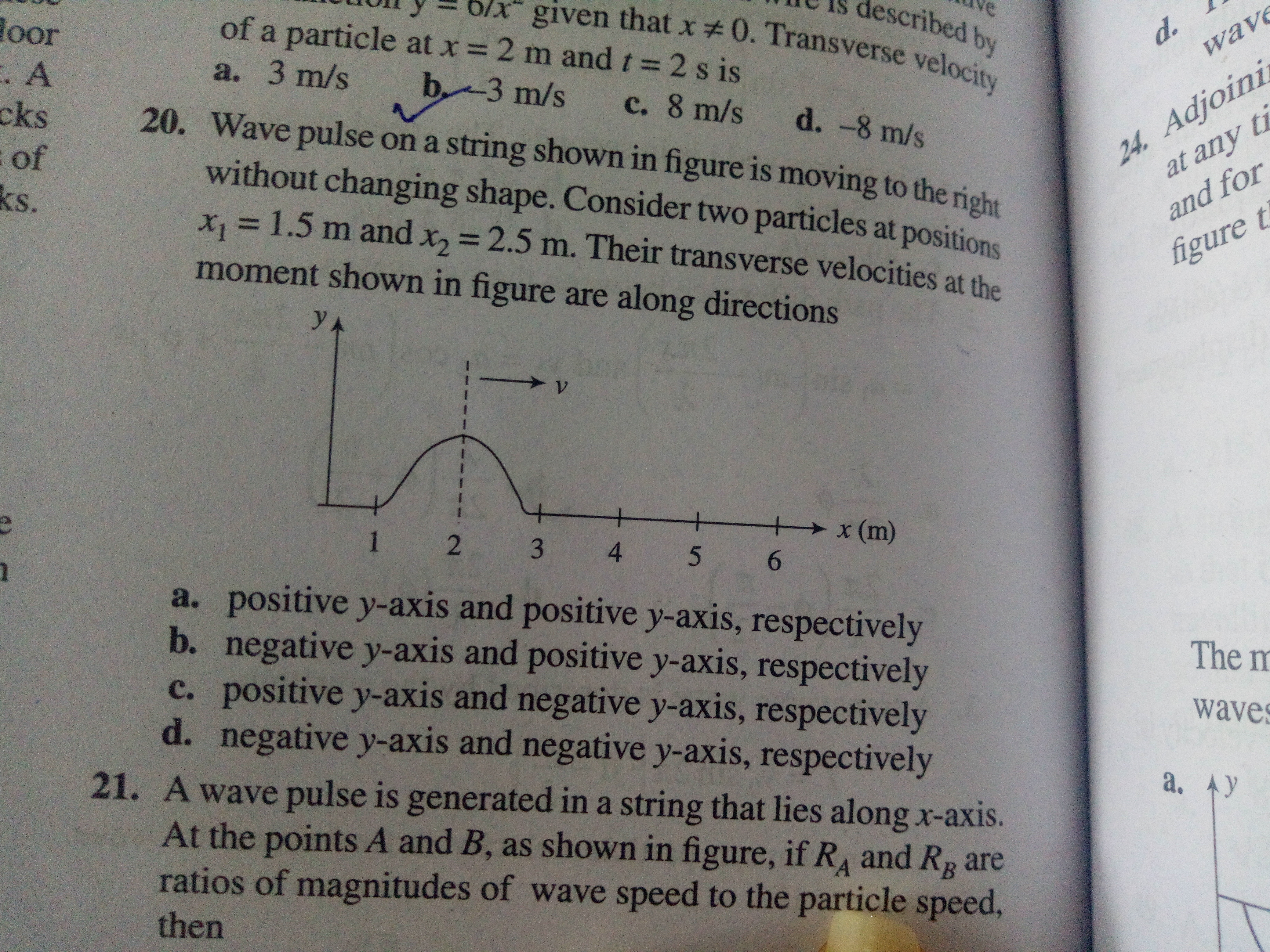 Wave pulse on a string shown in figure is moving to the right without changing shape. Consider two particles at positions xâ‚ = 1.5m and xâ‚‚ = 2.5m. Their transverse velocities at the moment shown in figure are along directions