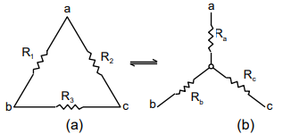 The familiar problem can be solved using Kirchhoff’s rule. Here, the problem is going to be simplified using Delta–star Transformation. Before going through the solution, let us understand this Delta–Star Transformation. This figure (a) and (b) show the Delta and Star respectively.