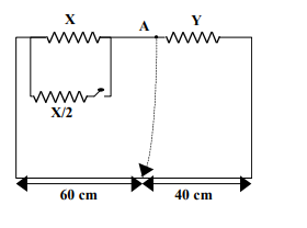 When two resistances X and Y are put in the left hand and right hand gaps in a wheatstone meter bridge, the null point is at 60cm. If X is shunted by a resistance equal to half of itself then find the shift in the null point.