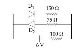 View SolutionThe circuit shown below contains two ideal diodes, each with a forward resistance of $50 \Omega$. If the battery voltage is 6 V, the current through the $100 \Omega$ resistance(in Amperes) is: