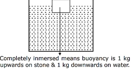 A beaker containing water is placed on the platform of a spring balance. The balance reads . A stone of mass and density is immersed in water without touching the walls of beaker. What will be the balance reading now?