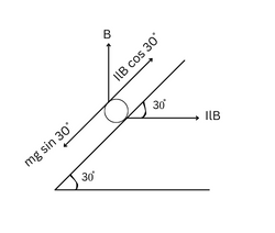 A metallic rod of mass per unit length 0.5 kg/m is lying horizontally on a smooth inclined plane which makes an angle of 30° with the horizontal. The rod is not allowed to slide down by flowing a current through it when a magnetic field of induction 0.25 T is acting on it vertical direction. The current flowing in the rod to keep it stationary is -