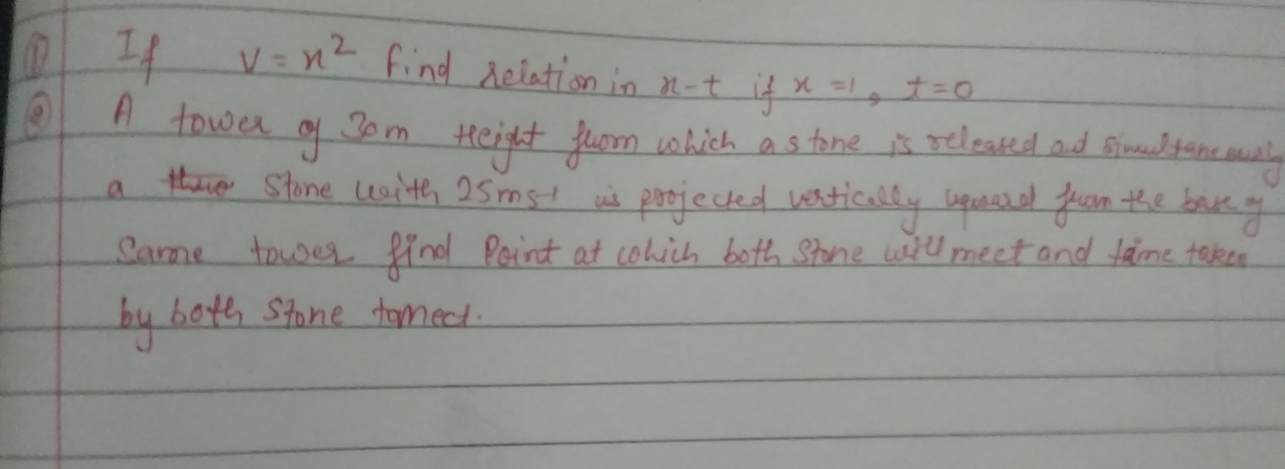 if v=x2 find relation between x-t if x=1 t=0 where x position t time v velocity