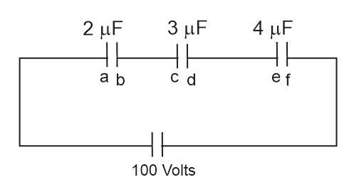 The capacitors are connected to DC-source of 100 volts shown in the adjoining figure If the charge accumulated on plates of ,