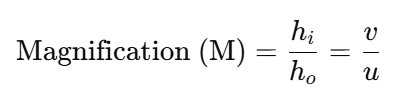 Magnification (M) is the ratio of the height of the image to the height of the object formed by a lens.